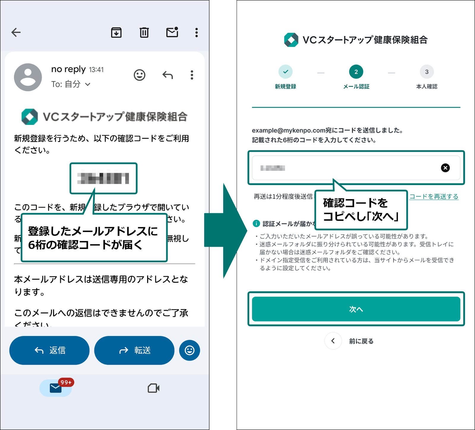 2. 登録したメールアドレスに6桁の確認コードが届きますので、コピーし、新規登録をした同じブラウザ画面で6桁のコードをご入力ください。