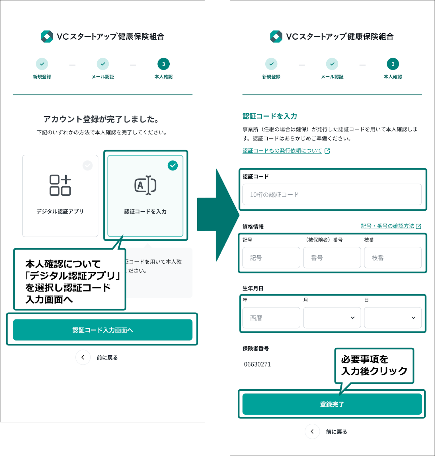 3. 本人確認の方法の選択画面で「認証コードを入力」を選択し、必要情報を入力後、【登録完了】をクリックいただくことで登録が完了します。