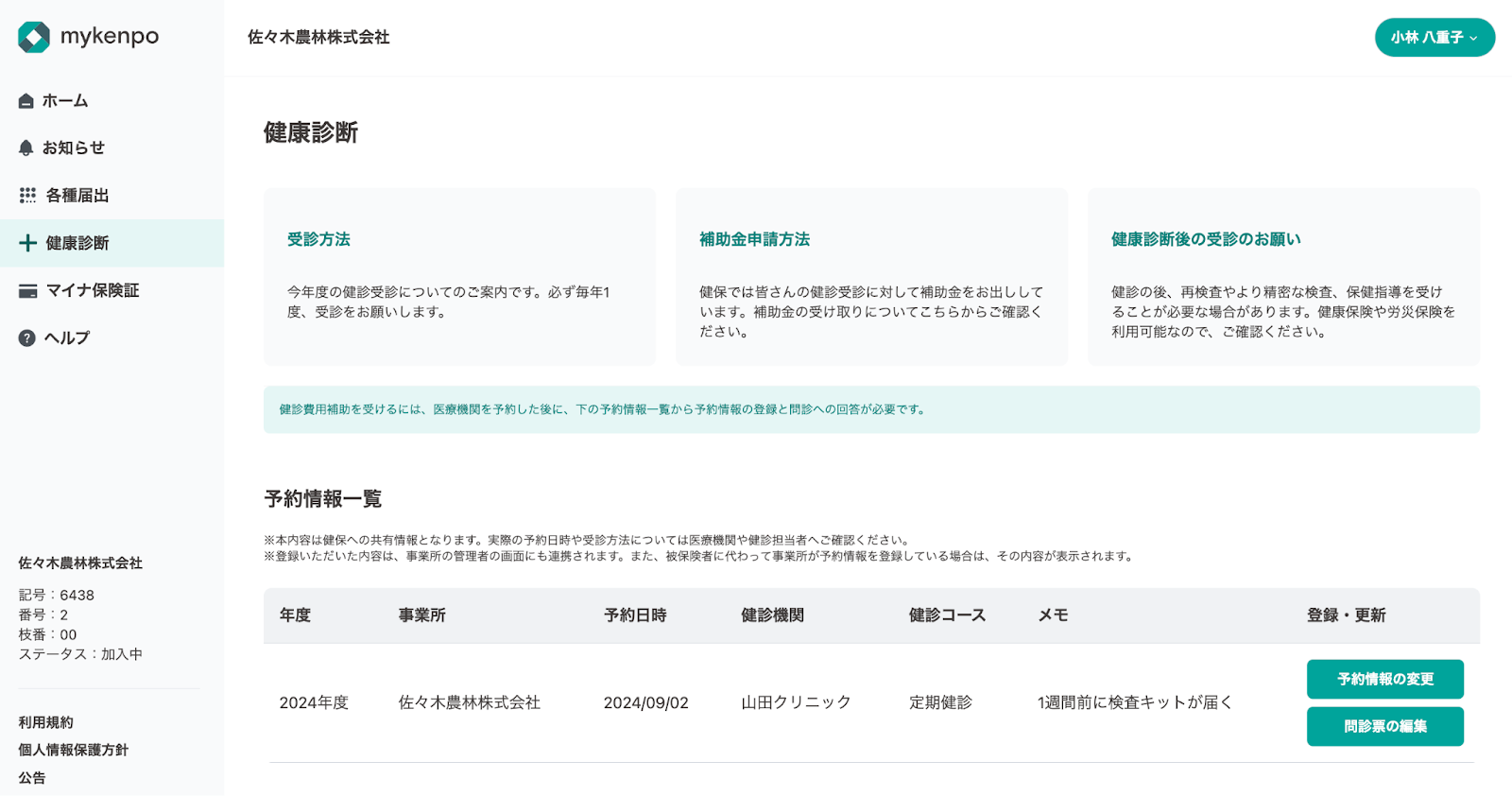 また、被保険者にご登録いただいた予約情報の内容と問診回答の有無は、mykenpoの事業所ユーザーのアカウントからご確認いただけます。事業所が被保険者に代わって健診予約を行っている場合は、事業所ユーザーのmykenpoから一括でアップロードいただくことも可能です。