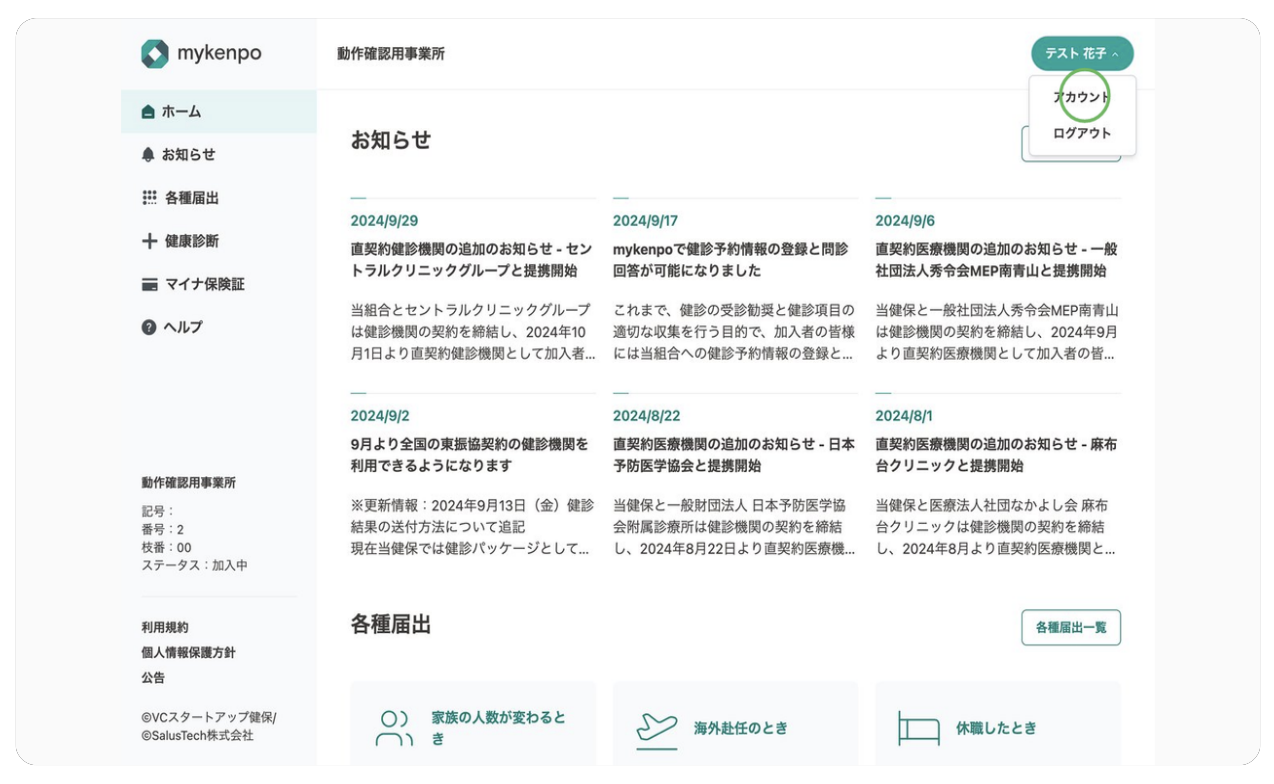 mykenpoにログインし、右上のユーザーのお名前(もしくはメールアドレス)のアイコンを押して、マイページからセキュリティ設定画面を開きます。