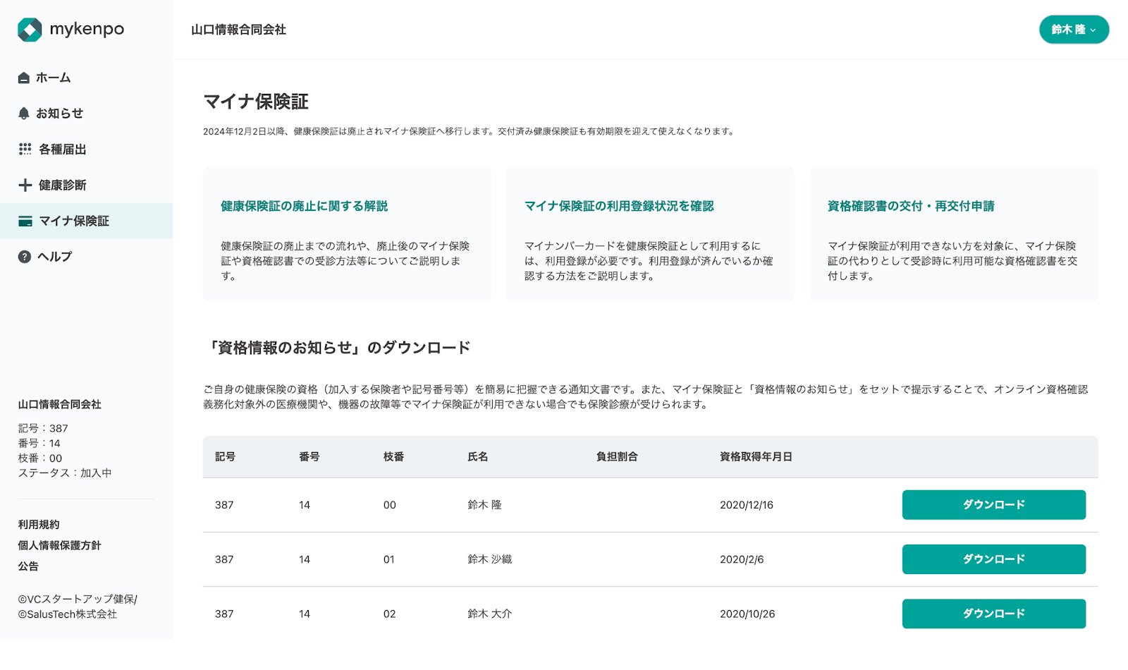 当組合に加入いただいた方へ、これまで健康保険証に記載されていた「記号・番号・資格取得年月日」といった情報を通知する目的で「資格情報のお知らせ」を交付します。当組合では、mykenpo上で加入者ご自身でダウンロードいただくか、事業所の方にダウンロードいただくことが可能です。