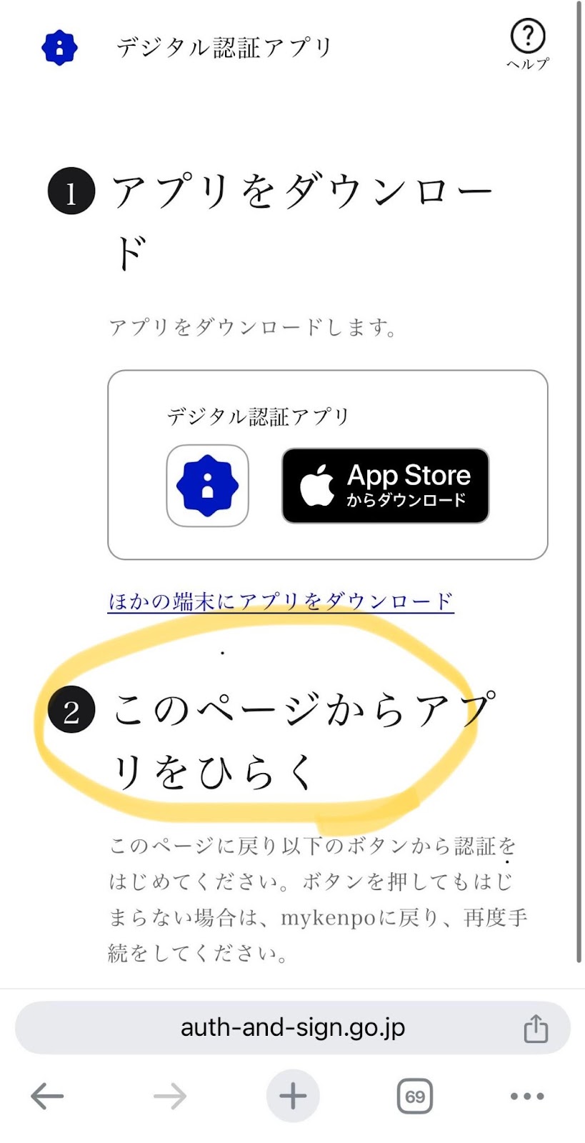 mykenpo画面の「マイナンバーカードで本人確認」から直接デジタル認証アプリが起動しない場合、一度デジタル認証アプリの説明が記載されたブラウザページに遷移します。その際に、デジタル認証アプリの説明ページの画面の「②このページからアプリをひらく」をクリックした場合、開かないことがあります。