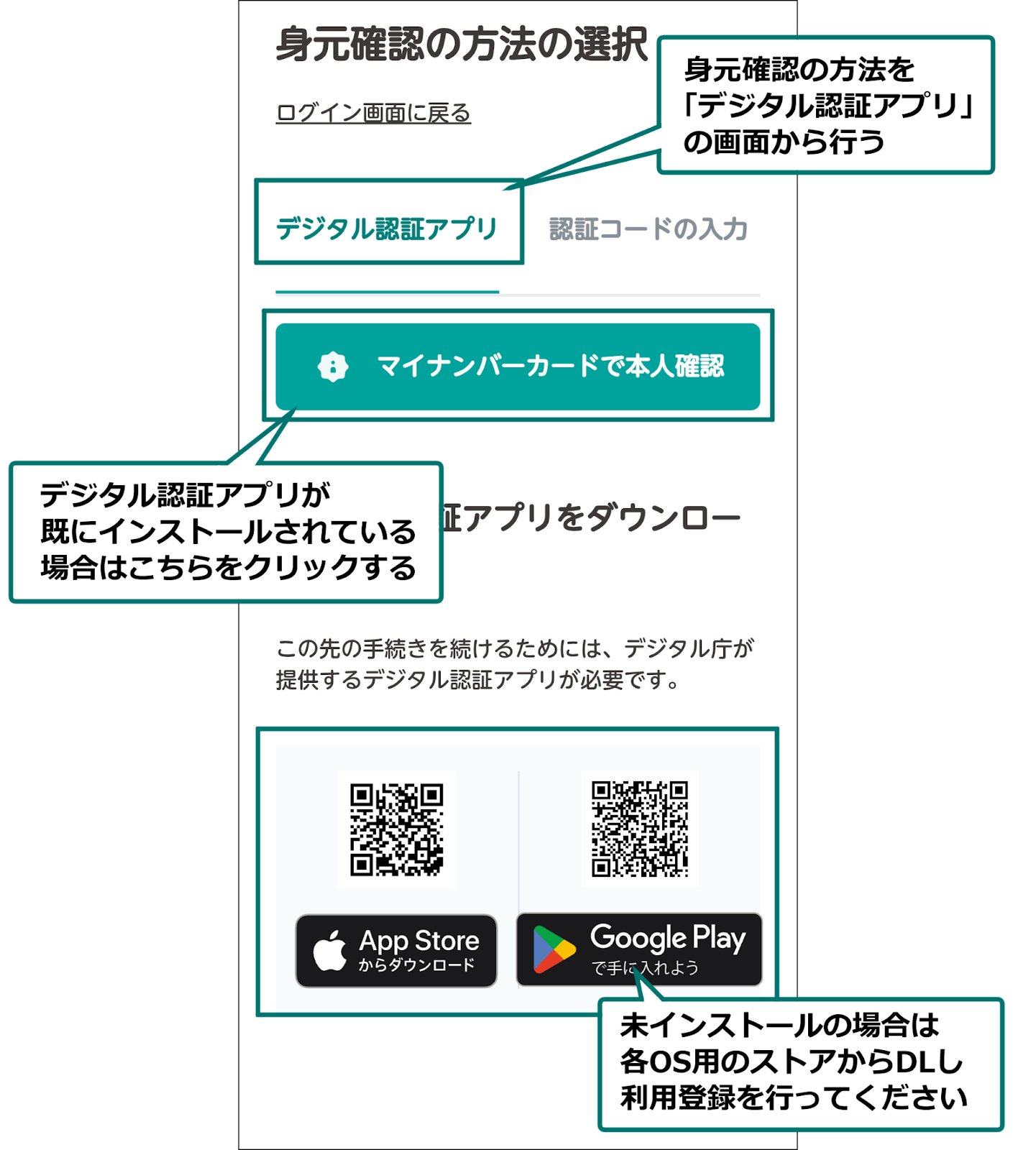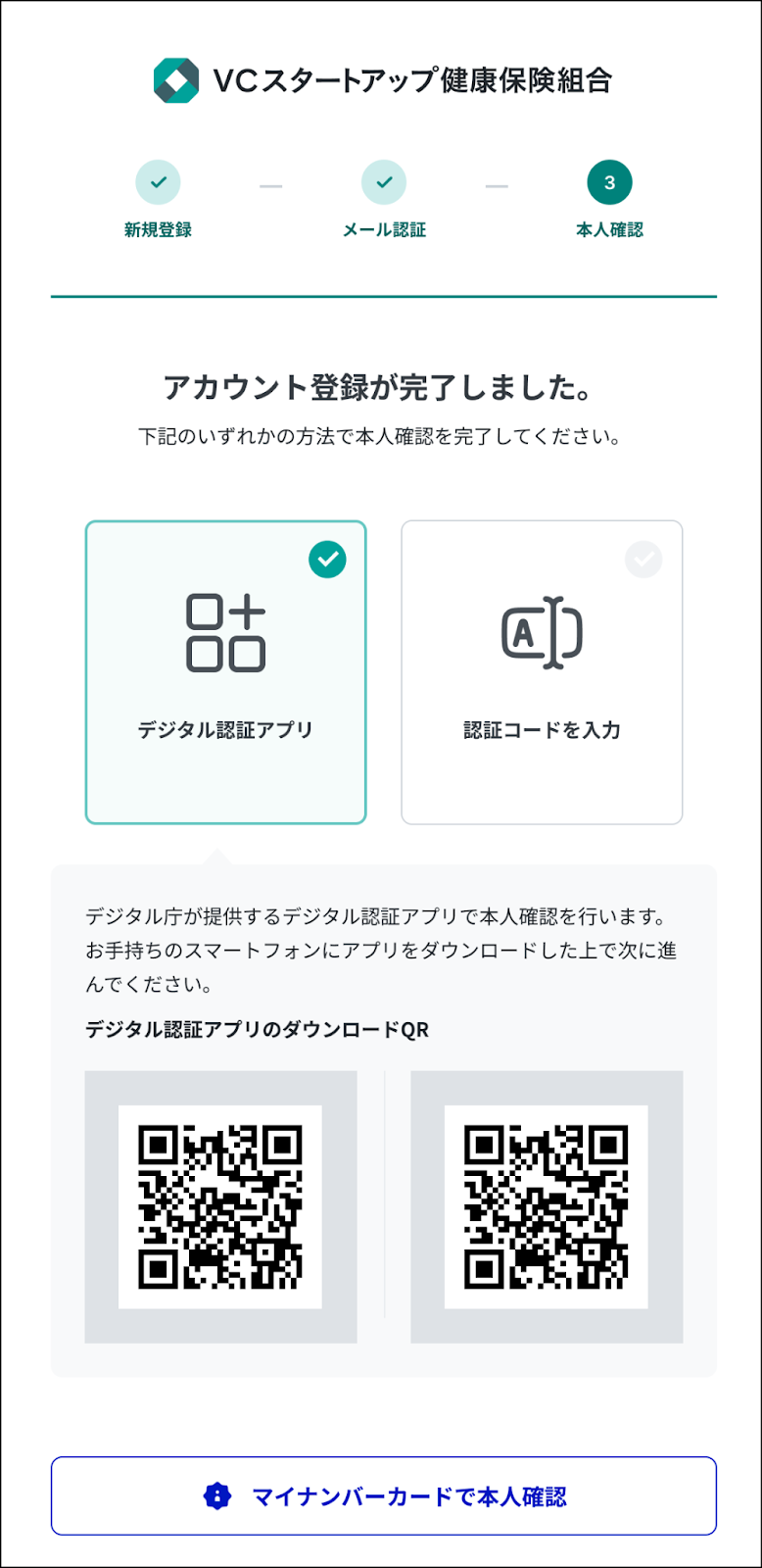マイナンバーカードがある方については、デジタル認証アプリで登録いただければ、認証コードは不要となります。次の手順で身元確認を行っていただき、ユーザー登録が可能です。