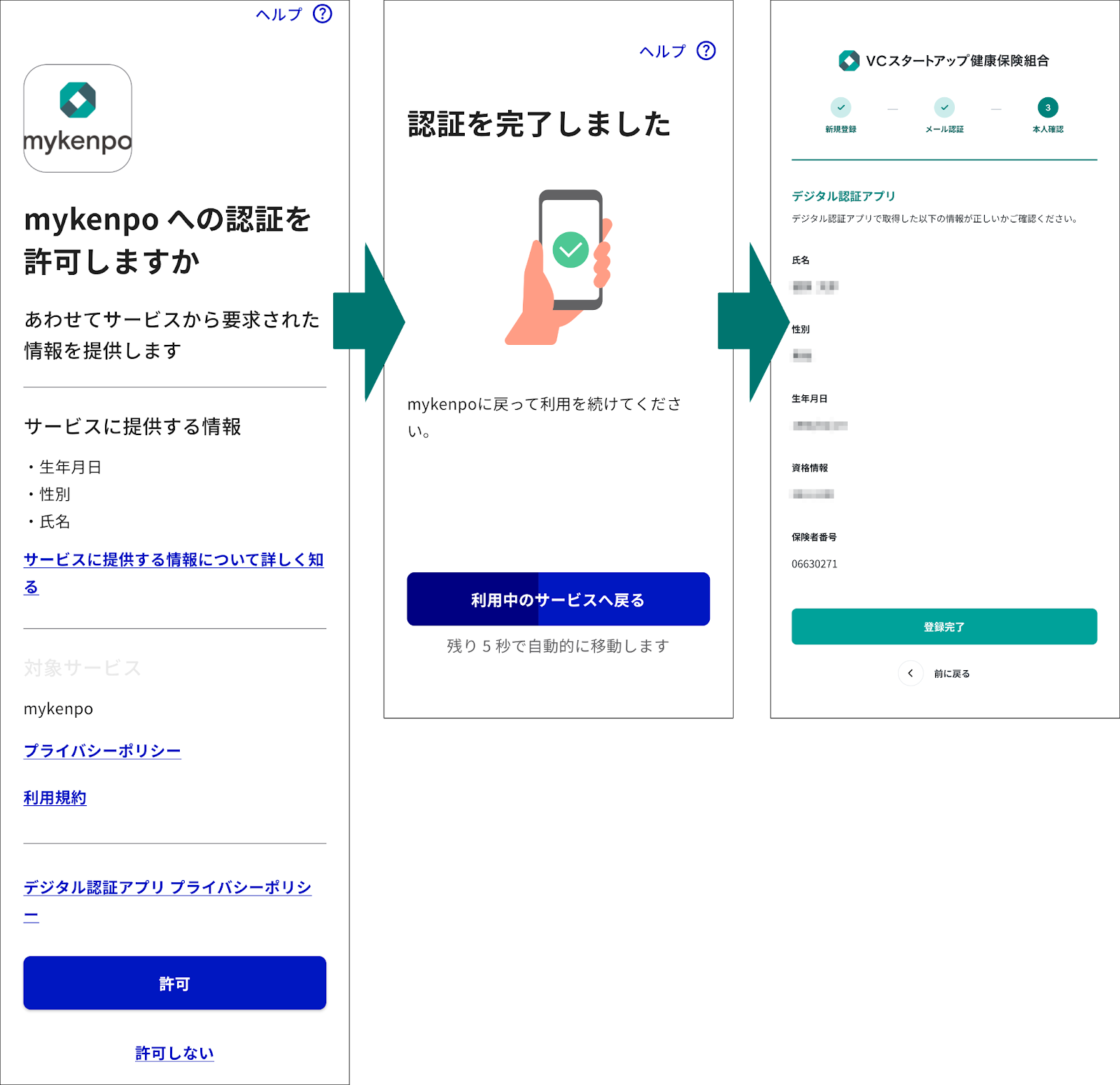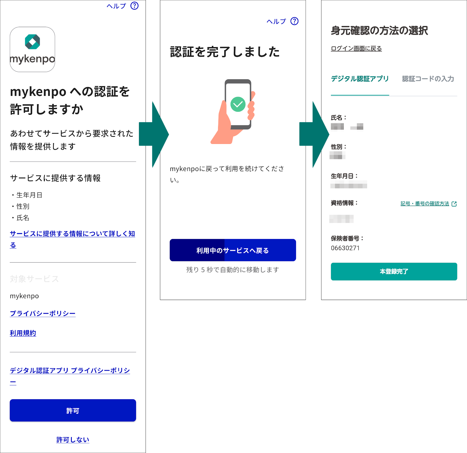 デジタル認証アプリ上で認証の操作を終えると、mykenpoページが本登録画面に遷移します。