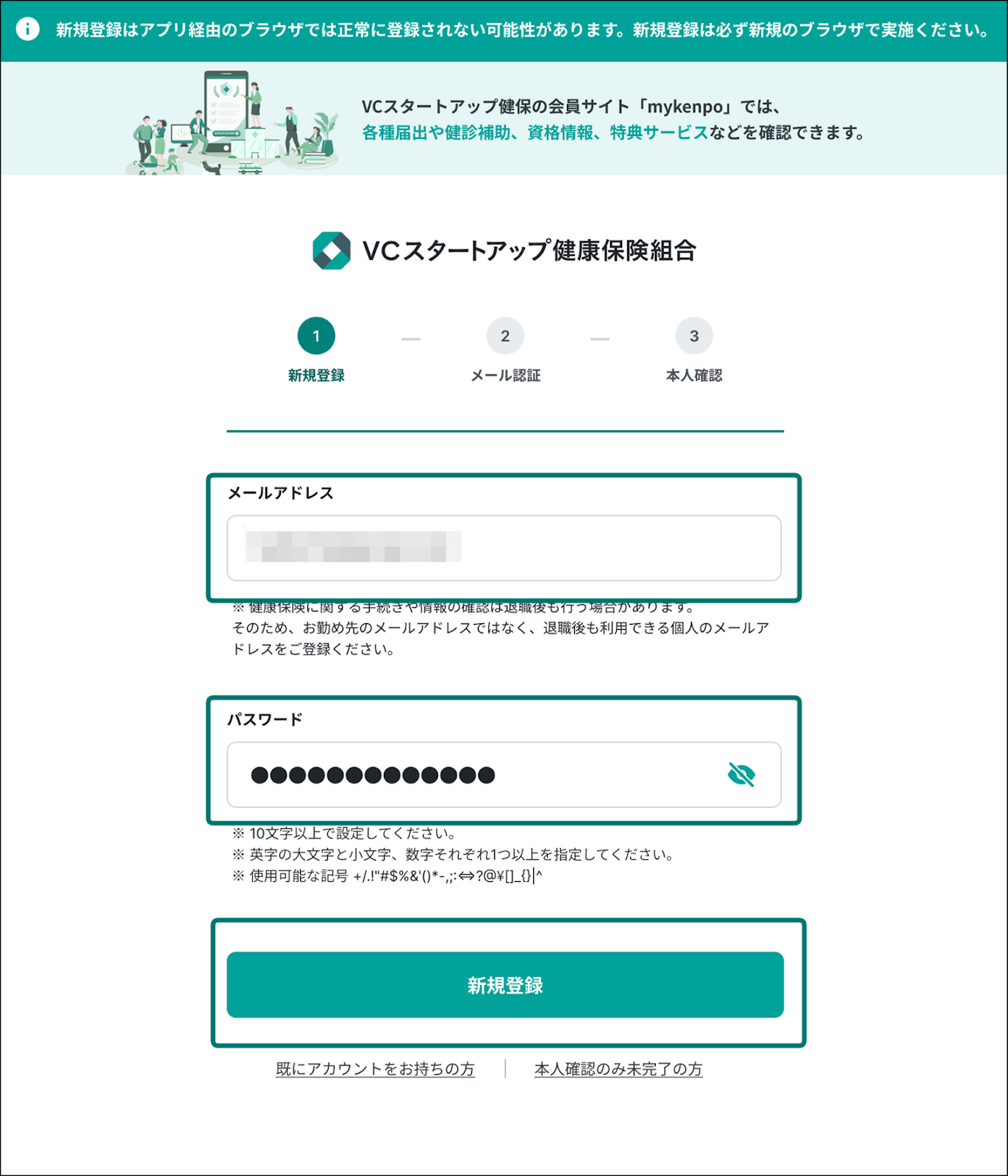 新規登録画面(https://members.mykenpo.com/ja/signup)にアクセスし、ご利用のメールアドレスとパスワードを入力してください。