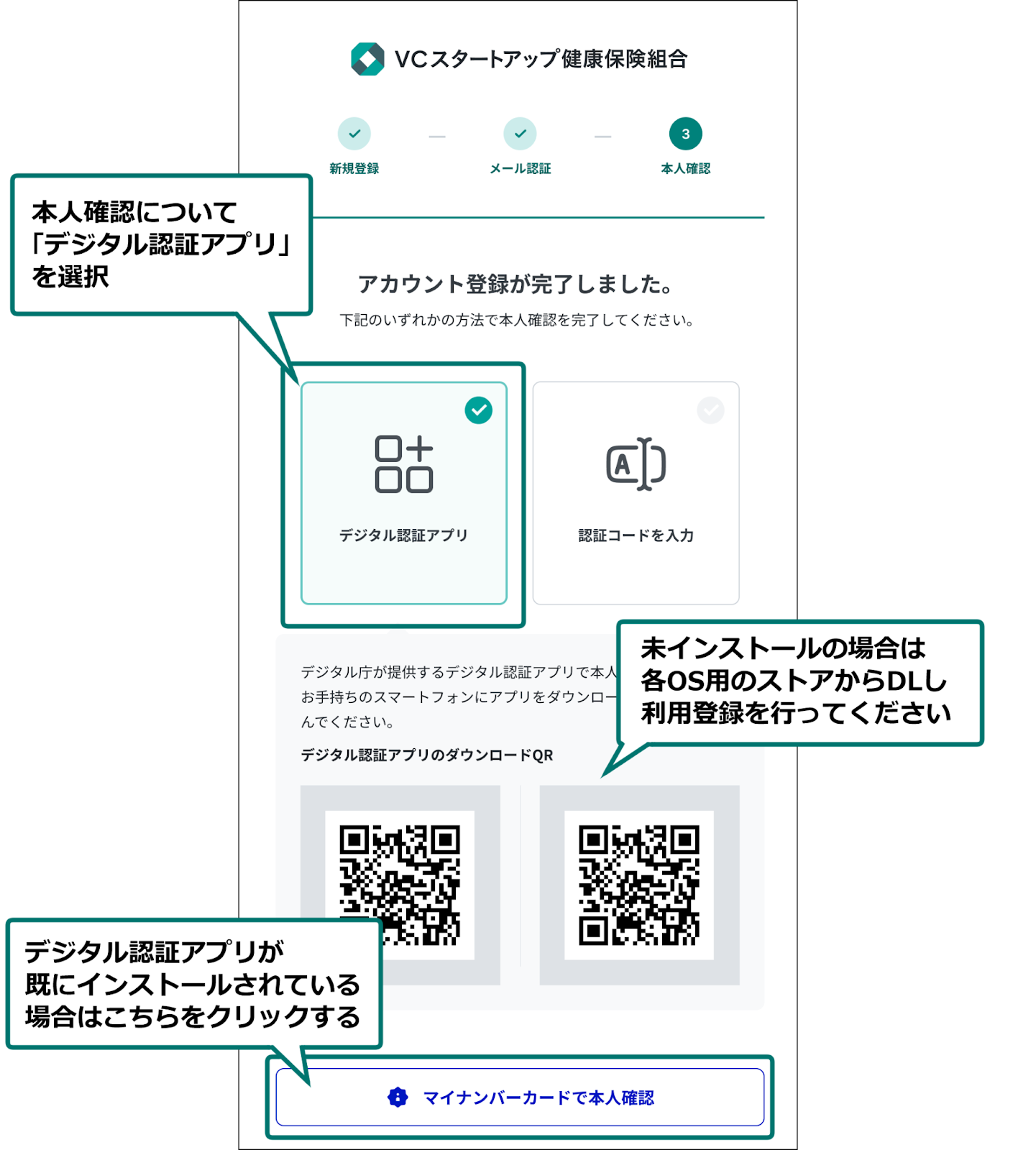 登録いただいたメールアドレス宛に届いた6桁のコードを入力し、本人確認方法で「デジタル認証アプリ」を選択、デジタル認証アプリをお手持ちのスマートフォンにダウンロードした後、マイナンバーカードで本人確認をクリックしてください。
