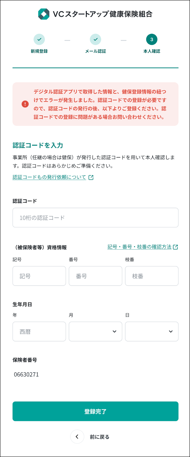 ※デジタル認証アプリで取得した情報(氏名・性別・生年月日)に一致するmykenpo未登録の加入者が2件以上存在する場合は本人確認画面で記号・被保険者番号・枝番を入力する画面が出ますので事業所担当者へ確認し、入力のうえご登録ください。