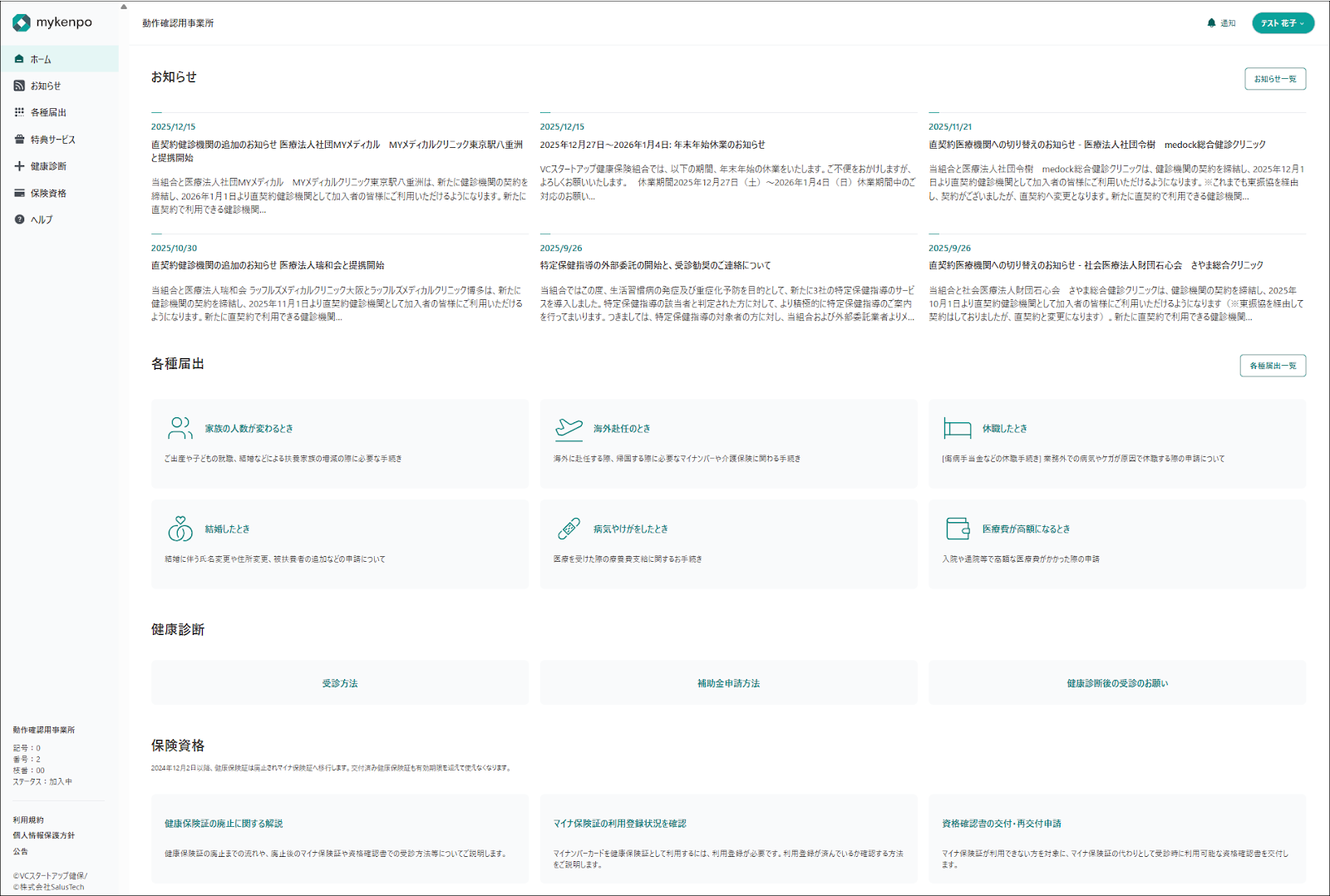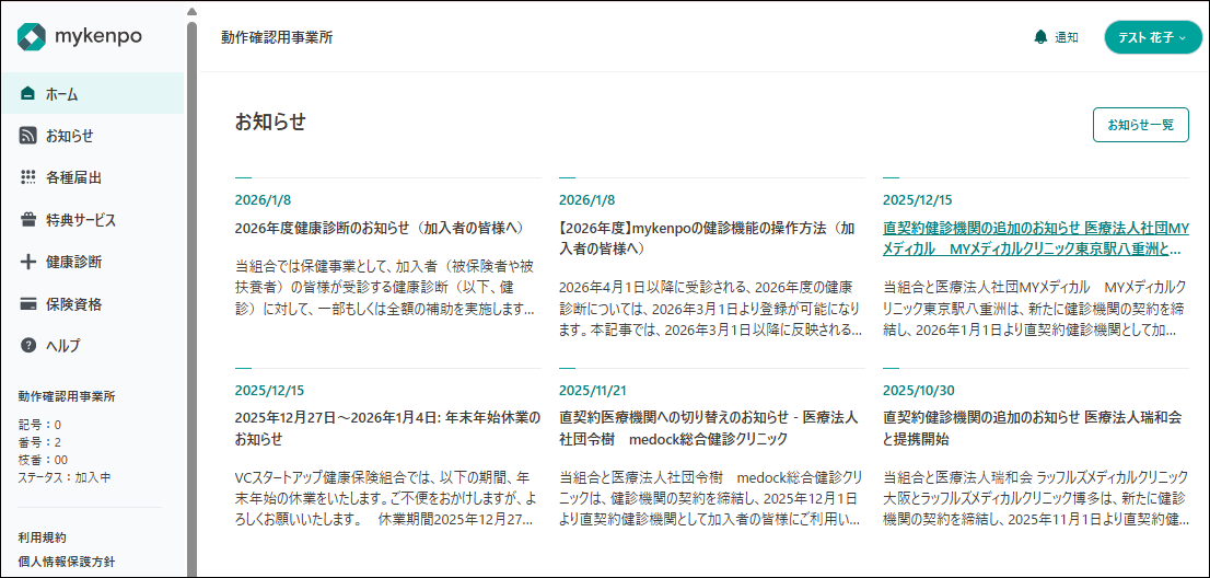 TOPページには新規直契約健診機関の追加や、次年度健康診断の詳細など組合からのお知らせが随時表示されます。