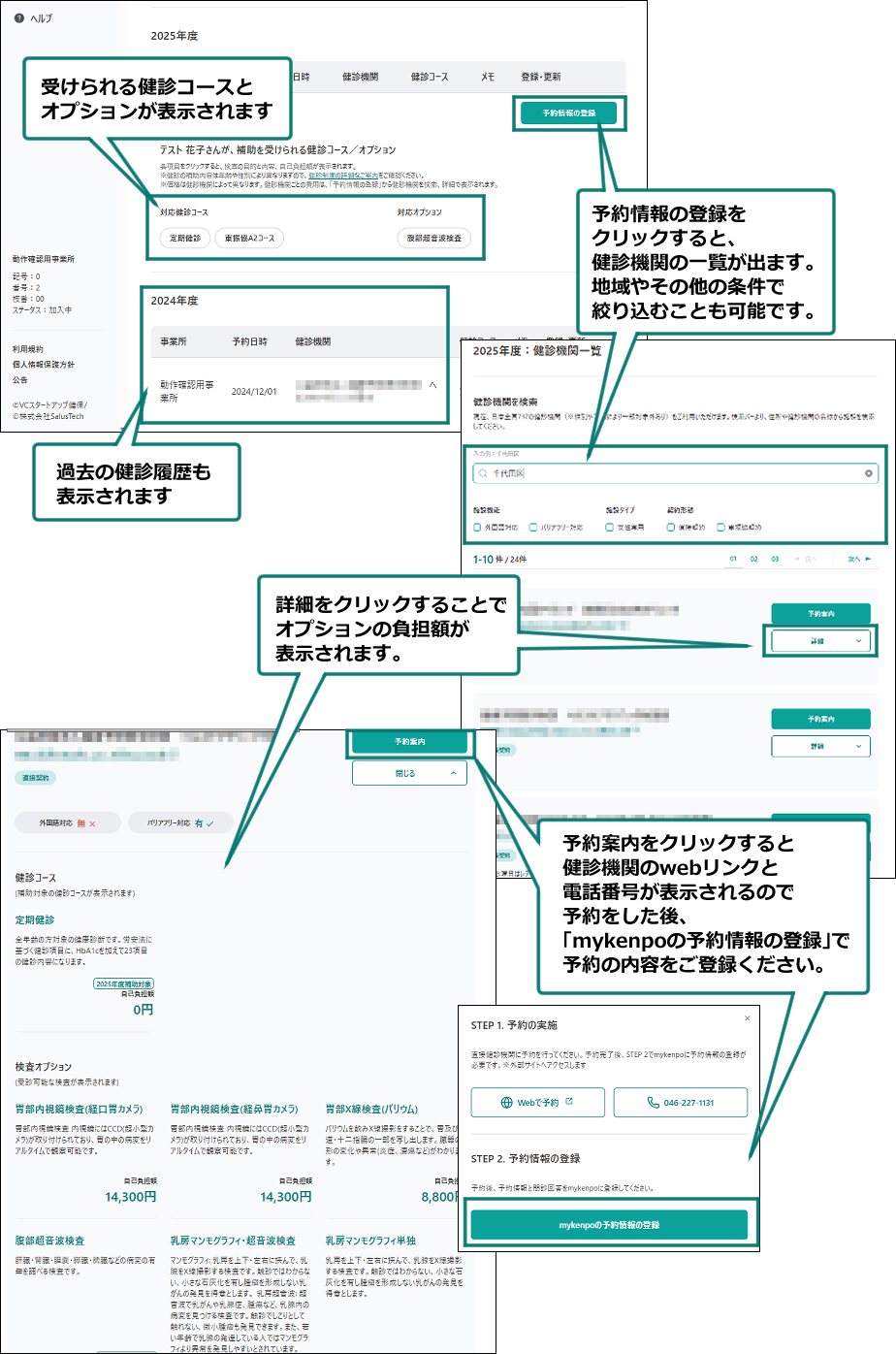 健診機関に連絡し、予約できたらその内容をmykenpoに登録することで健診の予約情報登録の完了です。