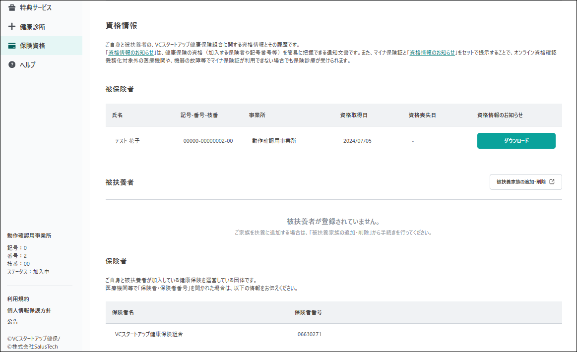 当組合に登録されている被保険者記号・番号・枝番、資格取得日、被扶養者の一覧などが確認できます。