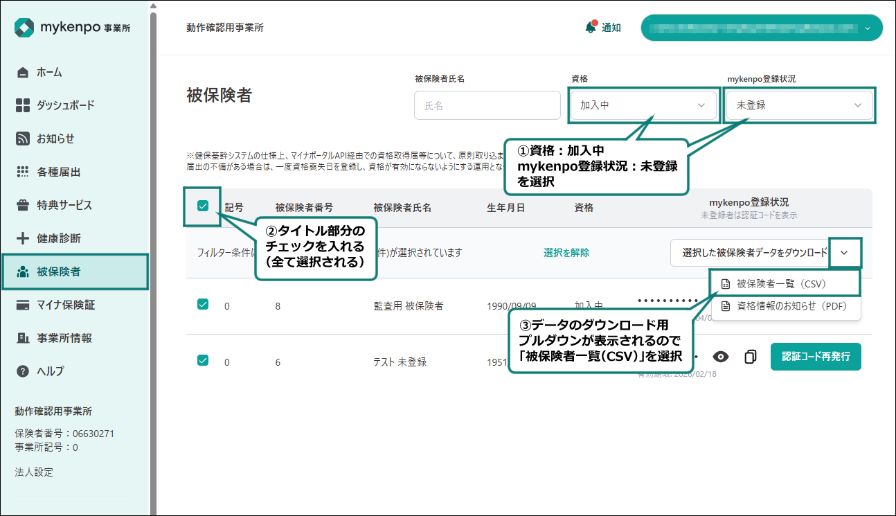 また、加入者がmykenpo上で健診の予約情報の登録を行うことで、事業所アカウントでは誰が健診予約を行っているか一覧で表示されるようになります。健診を予約していない従業員へ一斉リマインドを送信することもできますが、mykenpo登録済みの方のみとなるため、すべての被保険者に加入者アカウント登録をご案内ください。