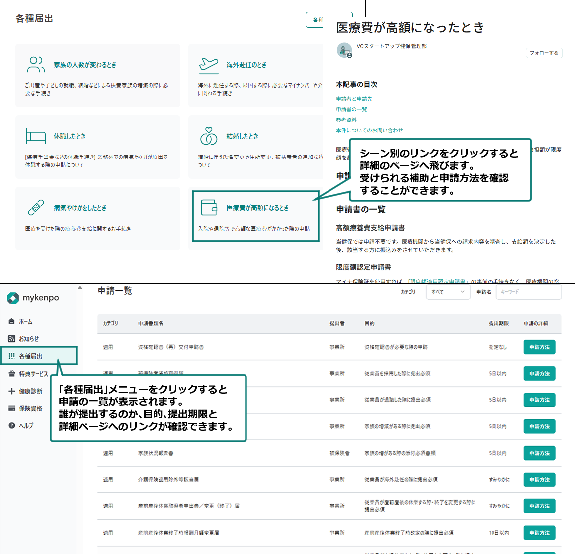 シーン別に必要な手続き詳細ページへ飛ぶリンクや、メニューをクリックすることで申請の一覧をご確認いただけます。