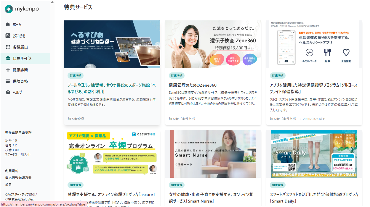 ヘルスケアや福利厚生分野で先進的なサービスを提供するスタートアップ等と連携し、加入事業所の健康経営や福利厚生強化、加入者の健康づくりを支援します。特典は割引価格や組合負担で利用でき、事業所・加入者個人双方にとって新たな付加価値を提供しています。